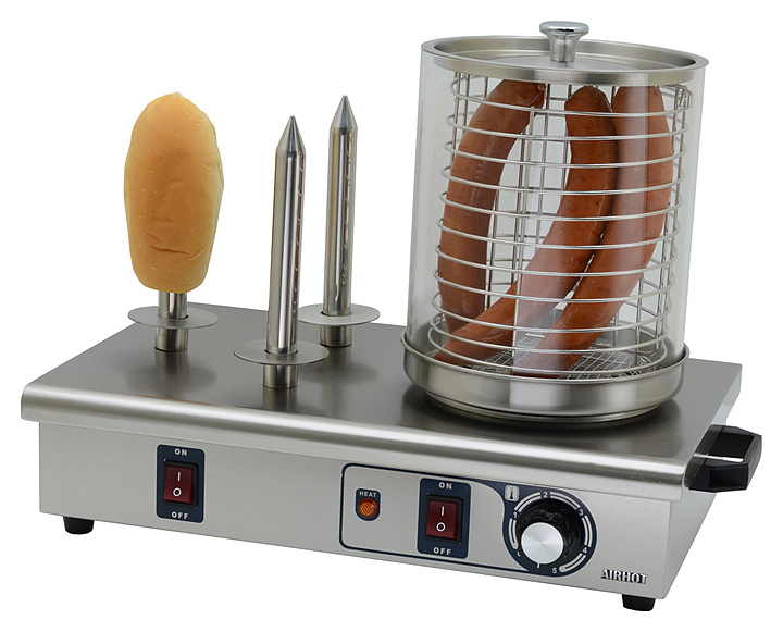 Аппарат для хот-догов AIRHOT HDS-03 оборудован стеклянной емкостью для варки сосисок и тремя штырями для разогрева булочек. Он идеально подходит для использования в кафе, ресторанах и на уличных торговых точках.