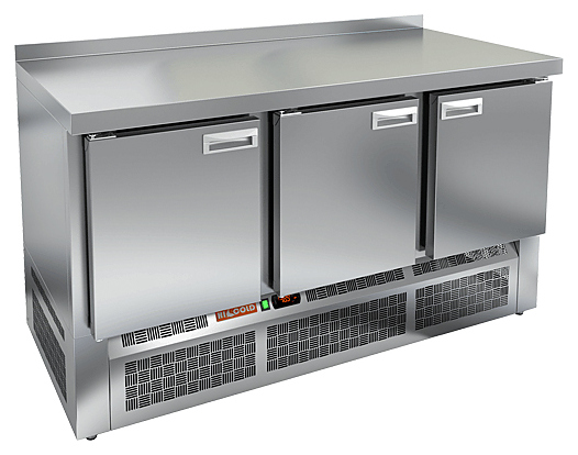 Стол холодильный с нижним расположением агрегата изготовлен из нержавеющей стали. Три распашные двери и столешница из камня.