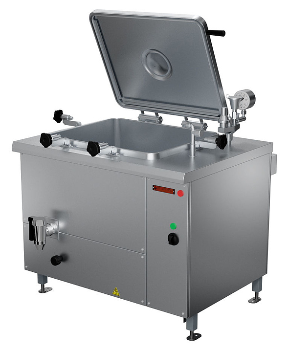 Состоит из прямоугольного варочного бака и металлического корпуса с крышкой. Каркас окрашен, а рабочий стол сделан из нержавеющей стали.